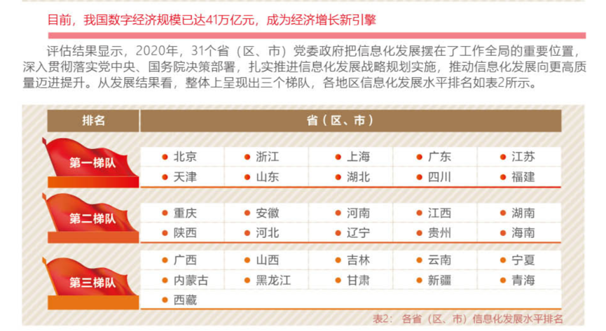 国家网信办组织有关单位,结合国家统计局、工业和信息化部、中央党校(国家行政学院)、人力资源社会保障部、中国互联网络信息中心(CNNIC)等部门和机构的统计数据和评价指数,开展了2020年各地区信息化发展评估工作,重点评估了31个省(区、市)信息服务应用、信息技术产业、产业数字化、信息基础设施、信息安全、发展环境等方面的发展水平。结果显示,2020年31个省(区、市)党委政府把信息化发展摆在了工作全局的重要位置,深入贯彻落实党中央、国务院决策部署,扎实推进信息化发展战略规划实施,推动信息化发展向更高质量迈进提升。从发展结果看,整体上呈现出三个梯队,各地区信息化发展水平排名如表所示。