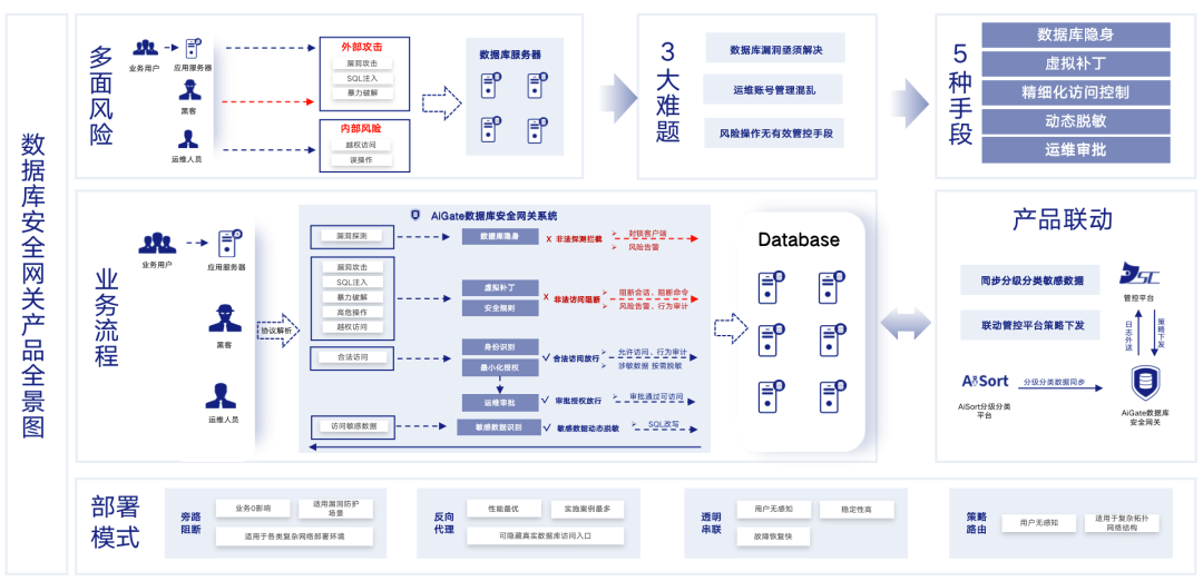 为了解决以上数据库安全建设面临的挑战,安恒信息为该医院客户推荐了安恒AiGate数据库安全网关系统(以下简称AiGate)。AiGate是安恒信息在多年数据安全访问控制理论和实践经验积累的基础上,集数据库准入、访问控制、攻击防护、动态脱敏、 运维审批等多种功能一体的产品。目前,该产品已在多个行业被广泛应用,保障着用户的重要数据和敏感信息。