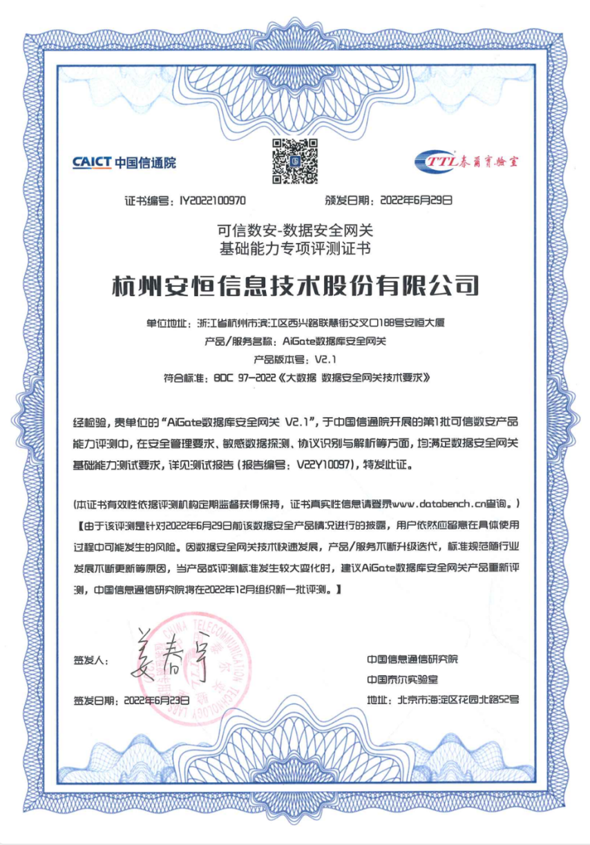 安恒AiGate数据库安全网关之所以能得到客户的广泛认可,离不开安恒信息多年数据库安全访问控制理论和实践经验积累。AiGate集成了安恒信息市场领先的数据库协议解析技术,并在多年现场实战中不断打磨沉淀真实客户场景,钻研有效实用的安全策略,为客户打造出了全方位的数据库安全防护体系。AiGate更是在去年首批通过信通院“数据安全网关”专项评测,在安全管理要求、敏感数据探测、协议识别与解析方面均达到认证标准。