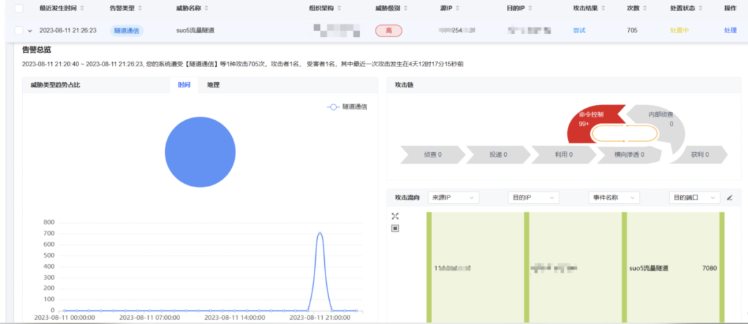 2023-08-11 21时20分,平台出现suo5隧道通信告警,告警源IP为114.254.3.33,被攻击系统为xx集团xx综合办公系统,一侠士发现后及时提报了该事件。
